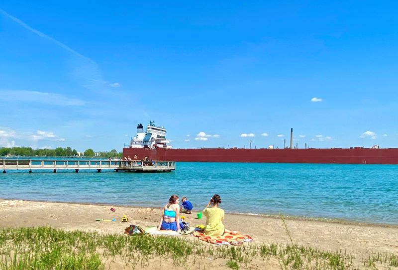 Beach & living shoreline walk on the St. Clair River with view of passing freighters. Also known as Chrysler Beach.