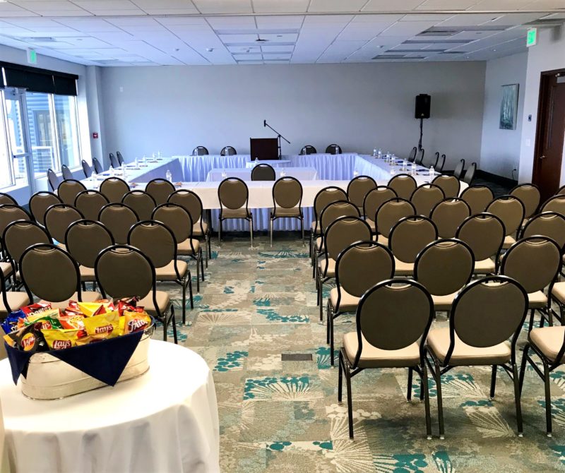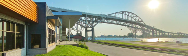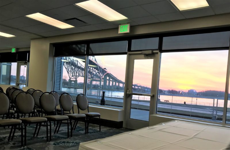 Overlooking the St. Clair River, the Blue Water Convention Center is situated beneath the magnificent span of the Blue Water Bridges to Canada. When you step inside, the Great Lakes Hall welcomes you with grand floor to ceiling windows leading you to a beautiful outdoor patio space scenery your attendees will not forget. The Lake Huron Hall, off of the Great Lakes Hall, has over 20,000 square feet of space with 20′ ceilings and a wall of windows with waterfront views of passing ships. The facility has a variety of break-out rooms for any size meeting to accommodate your needs with interior spaces or water view options. The entire convention center is wheelchair accessible with convenient same level parking for minimal walking. Hearing impaired rooms are also available upon request.